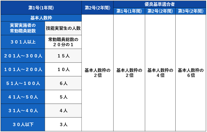 受け入れることのできる実習生は実習実施機関(受け入れ企業)の常勤職員総数によって決まっています。